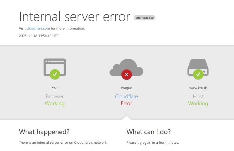 - Dopad na weby: Výpadek rychle postihl weby zvučných jmen, jako je sociální síť X, chatovací gigant ChatGPT nebo česká Alza, některé banky či populární kra.sk. Prostě kdo byl za Cloudflarem, na chvíli zmizel z mapy.